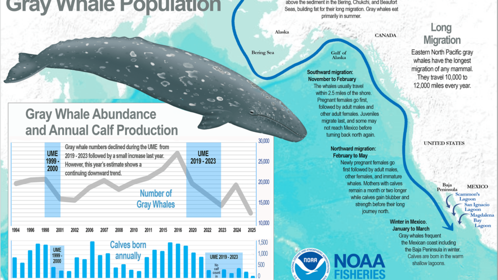 The eastern North Pacific population of gray whales that migrates along the West Coast of the United States has continued to decline, with reproduction remaining very low. Two new Technical Memorandums from NOAA Fisheries’ Southwest Fisheries Science Center report the estimated population size and calf productivity in 2025.
