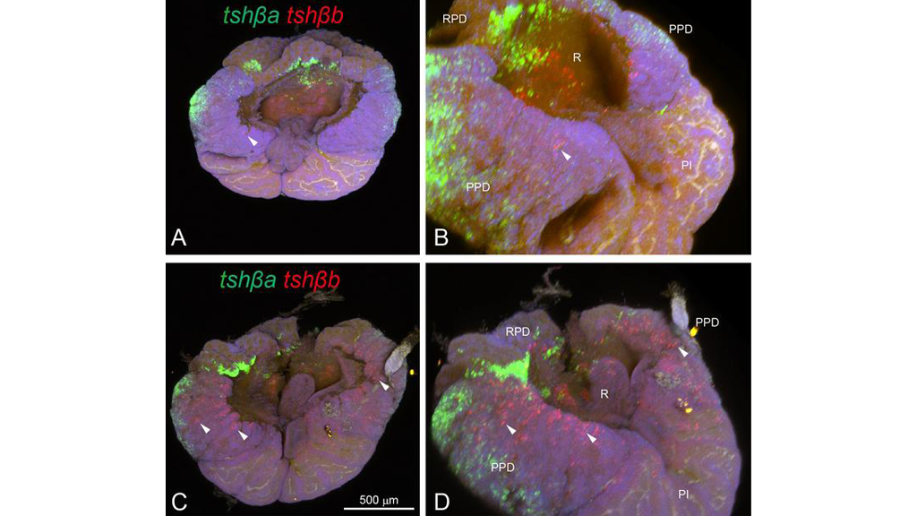 Above photo: When the pituitary glands of salmon are themselves exposed to daylight, they light up with TSH (red and green).Credit Stephen McCormick